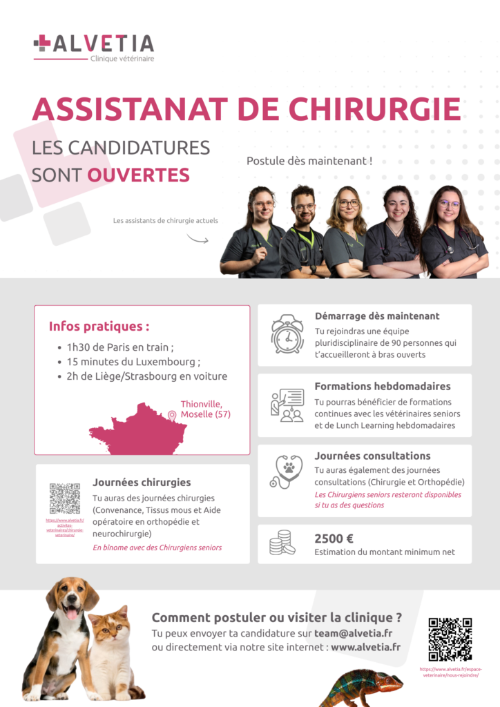 Notre clinique vétérinaire indépendante Alvetia recherche un Assistant(e) en chirurgie vétérinaire (H/F) pour rejoindre une équipe soudée, engagée et sympathique.